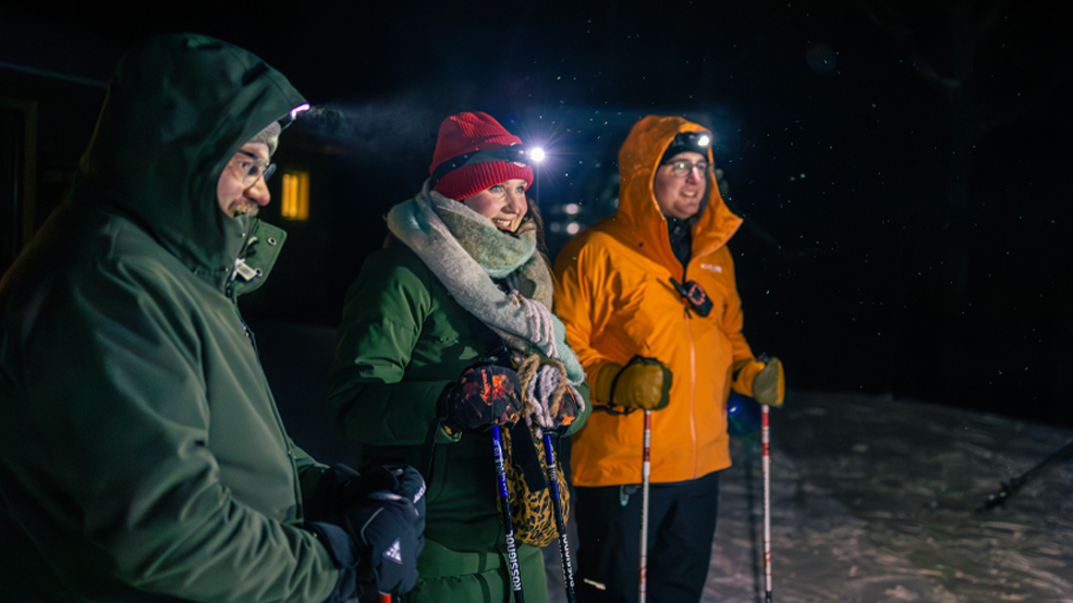 Après le repas, les participants prennent part à une randonnée guidée en raquettes sur un tronçon de 2 km du sentier Kick and Push. Munis de lampes frontales, ils descendent sous la lumière de la lune pendant que les guides partagent des récits sur l’histoire locale et la géologie de la région. La soirée se termine par un retour à la base, où les invités peuvent se rassembler autour de douceurs hivernales et d’activités extérieures.